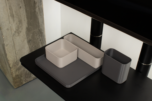 Keep every space tidy with our 3D-printed, sustainable organiser sets. Designed for bathrooms, kitchens, offices, homes, and crafts, our sets provide tailored storage solutions for bath essentials, baby items, office supplies, kitchen tools, art supplies, and kids’ crafts.